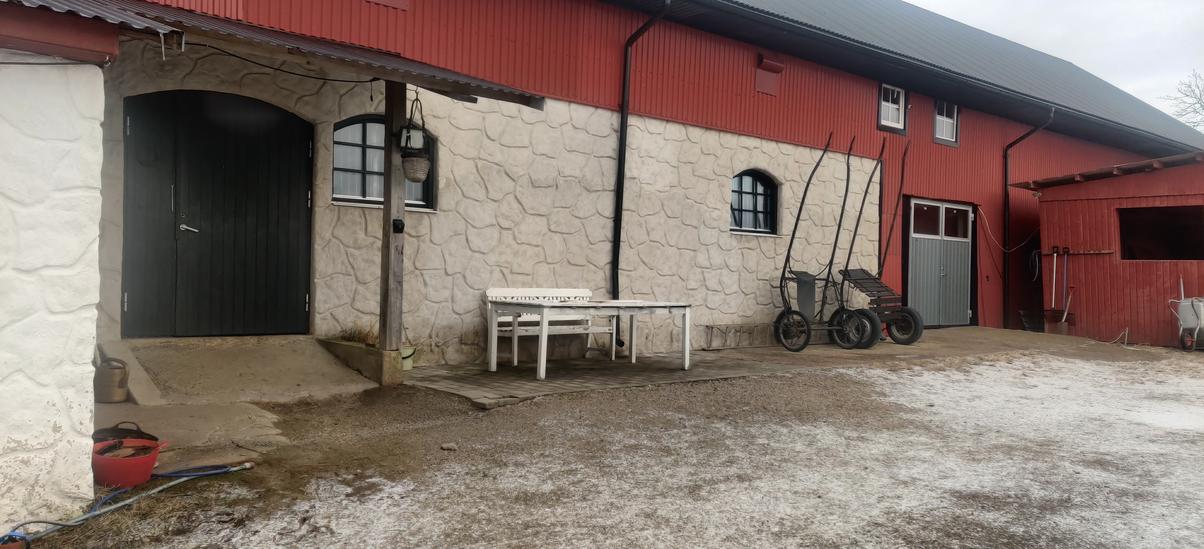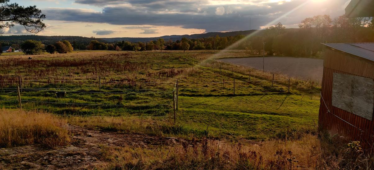 Vår nymålade och renoverade lös drift är (mått) stor och ger skydd (antal) hästar undan vädret